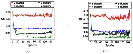 V. Quantization error: Figure 5 illustrates the training and testing QEs of all 4 SOM configurations. In this figure, each NN shows a significantly low quantization error, with the lowest observed in the training data. The NN with 6 outputs has the smallest error ( in training, in testing). The errors were larger for the NNs with 5, 4, and 3 outputs, respectively, with errors increasing as the number of output neurons (clusters) decreased.