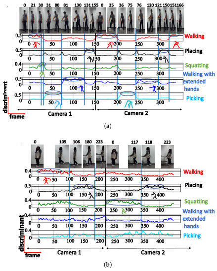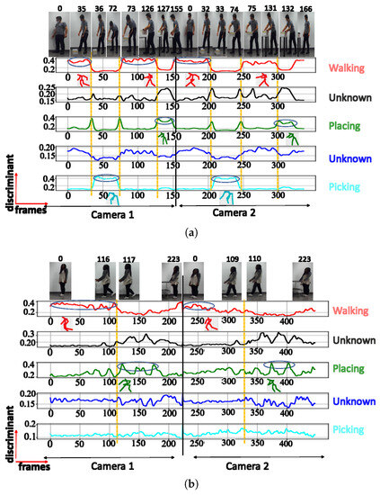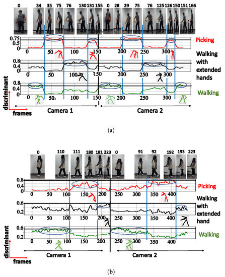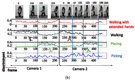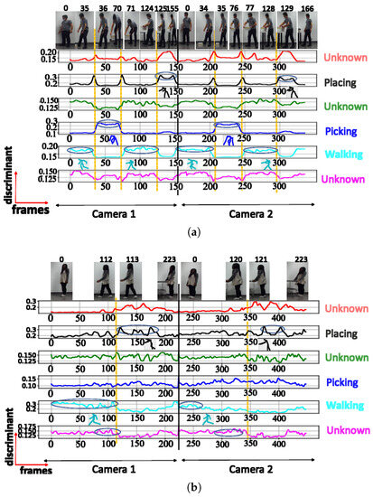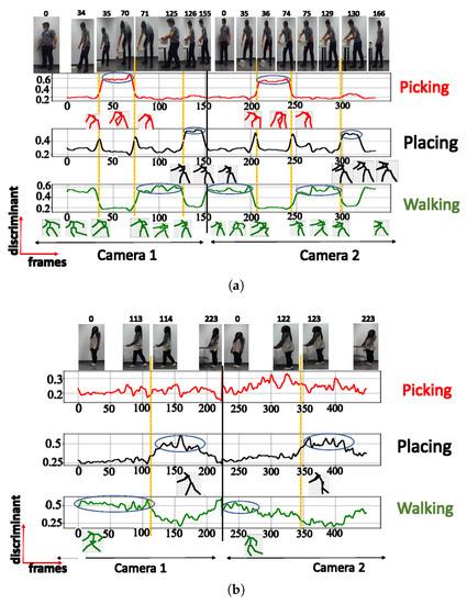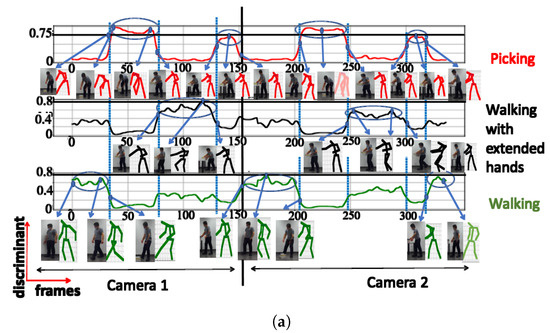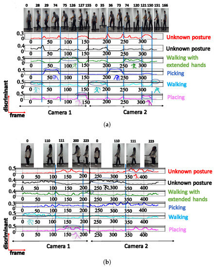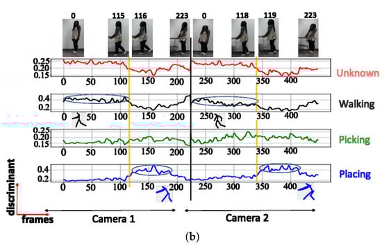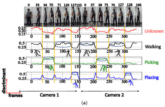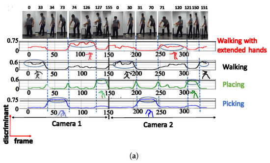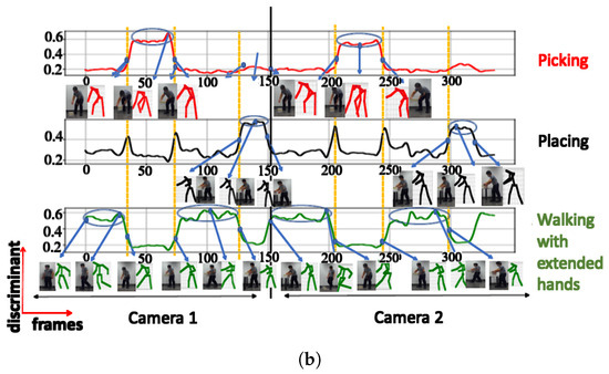 A. NN trained using cosine distance: For the architecture with 3 clusters, the following postures were indicated: ‘walking’, ‘picking’, and ‘walking with extended hands’, with a maximum score of (see Figure 6a). When testing with a configuration of 3 clusters using the UA activity, the same 3 groups of postures were also recognized (see Figure 6b), as shown in Table 2. The postures represented by the highest peaks in the discriminant score plots exhibit the highest discriminant values and are highlighted with circled peaks for identifying the winning postures in the activity’s particular frame range.