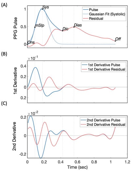 Fiducial points of the PPG pulse (onset, offset, maximum slope point, systolic peak, diastolic peak, and the dicrotic notch) were located using a custom algorithm [17], which combined the derivatives approach [31] with Gaussian fitting [32]. First, a Gaussian (“gauss1” function from Gaussian model library) was fitted to the systolic arm of the PPG pulse (dashed blue line in Figure 2A), and its subtraction from the main pulse wave produced the residual wave (red line in Figure 2A). The max slope point was defined as the 1st peak of the 1st derivative pulse (blue line in Figure 2B), while the systolic peak was where the 1st derivative of the PPG signal crossed zero for the 1st time between max slope and offset (blue line in Figure 2B). The dicrotic notch corresponded to the largest peak on the 2nd derivative pulse wave (blue line in Figure 2C) within the window from the 2nd peak of the 1st derivative residual wave and the 3rd peak of the 1st derivative pulse. The diastolic peak was the 1st peak after dicrotic notch on the pulse wave (blue line in Figure 2A). Finally, amplitude- and duration-based PPG features were extracted for each pulse.