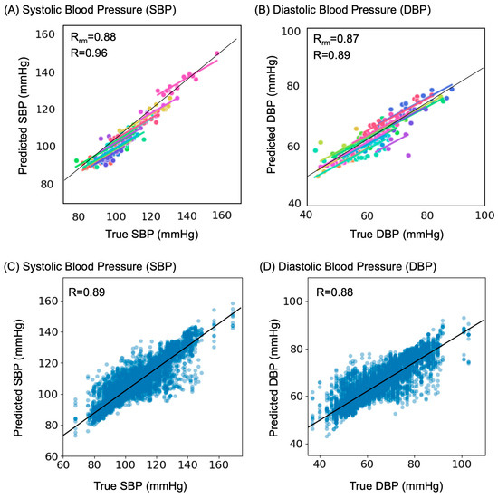Next, we investigated the strength of the relationship between true and predicted BP via correlation. Figure 4, A and B exemplify results from a representative test set of one split. The Pearson correlation was 0.96 between true SBP and predicted SBP (Figure 4A) and 0.89 between true DBP and predicted DBP (Figure 4B). Similarly, the repeated measures correlation coefficient (Rrm) was 0.88 for SBP (Figure 4A) and 0.87 for DBP (Figure 4B), indicating a strong within-individual association for this sample. Figure 4C and D depict Pearson correlations across all sample points for SBP (R = 0.89) and DBP (R = 0.88), respectively.