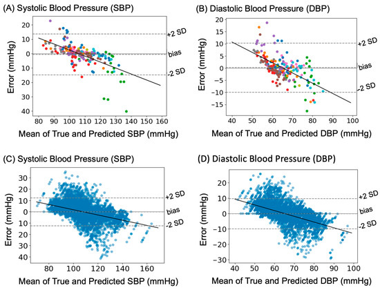 Systematic errors between true and predicted BP values are shown in Figure 6. Bland–Altman plots in Figure 6A,B exemplify the bias pattern for SBP and DBP for a representative sample (from a 1 test fold of 1 split). There was a −0.55 mmHg bias between true and predicted SBP and 0.18 mmHg bias between true and predicted DBP, with a visible proportional bias. Figure 6C,D display the error for all test samples, as an illustration of model performance. Overall, the SBP and DBP were slightly underestimated with a mean bias of −0.13 mmHg and −0.08 mmHg across all samples.