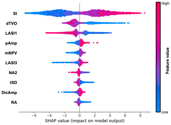 Beeswarm plot with 10 most important PPG waveform features based on SHAP values: SI: stiffness index, dTVO: minimum to offset time in first derivative, LASI1: inverse time from dicrotic notch to systolic peak, pAmp: pulse amplitude, mNPV: modified normalized pulse volume, LASI3: inverse time from diastolic peak to maximum slope point, NA2: normalized area under maximum slope point to systolic peak, tSD: descending time, DicAmp: dicrotic notch amplitude, RA: area ratios between onset to dicrotic notch and dicrotic notch to offset. Features are ordered according to their importance from top to bottom. The x-axis represents log odds. Colouring shows the direction of this association, where blue indicates lower values of a given measure and red indicates higher respective measure values.