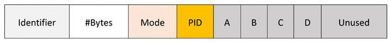 A diagnostic protocol called OBD-II is used to collect emissions information for analysis and monitoring purposes [21]. According to the SAE J1979 standard, each OBD-II PID comprises a code that requests specific data regarding a certain parameter of the vehicle (e.g., engine speed) [22]. Although not all vehicle parameters are covered by OBD-II PIDs, the vehicle manufacturer has the flexibility to modify PIDs utilizing a different diagnostic protocol (e.g., UDS). When a diagnostic tool is attached to the OBD-II port, the ECU responds immediately to the sent OBD-II request. The typical format of an OBD-II frame is shown in Figure 1, where the identification field indicates whether it is a response or request message and the number of bytes field indicates how many bytes are required for each parameter. The OBD-II contains ten modes, some are utilized for retrieving and clearing recorded trouble codes, while others provide real-time information (e.g., RPM). The mode, wherein PIDs are defined, is given in the third field of the OBD-II frame. The relevant PID is contained in the frame’s fourth field. Some PIDs have the formula to convert the relevant PID value to decimal with respect to its minimum and maximum values. The transmitted hexadecimal data bytes that require to be translated into logical values are in the A, B, C, and D fields.