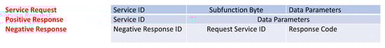 A diagnostic protocol called UDS could be employed for several communication buses. It provides the flexibility to the vehicle’s manufacturer to define customized PIDs to be analyzed and preprogrammed. The ECU responds to the UDS request with either a negative or positive response using the UDS message format described in Figure 2 to carry out the diagnostic communication over UDS. The Service Identifier (SID) is the first field of the message that is used to differentiate between the request and response messages. Since the Subfunction field is included in certain UDS messages, it is optional. The configuration and additional details of the required parameter are listed in the data parameter field.