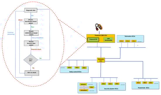 Our framework is located in the end node that is connected to the OBD connector to be a self-invasive system as shown in Figure 3. The framework is deployed in the Open System Interconnection (OSI)’s application layer for generalization. When an ECU with the requisite PID receives a diagnostic request from the framework across the linked bus, it may either reply instantly or divert the message to another ECU that is not directly linked to the end node. After receiving the request, the intended ECU provides the framework with the value of PID. The framework checks the diagnostic parameter based on its specification in the first phase and if the value is abnormal an alert will be raised; otherwise, the diagnostic parameter is sent to the second phase to be processed by XGBoost and GAN models to produce the probabilistic outputs for each class to the third phase. The third stage takes the final decision based on the probabilistic inputs. If the PID is suspected to be malicious, DTC is checked whether an error occurs; otherwise, the aforementioned PID has been manipulated. The actions that could be taken after detecting attacks in the framework could be determined by the vehicle companies’ manufacturers.