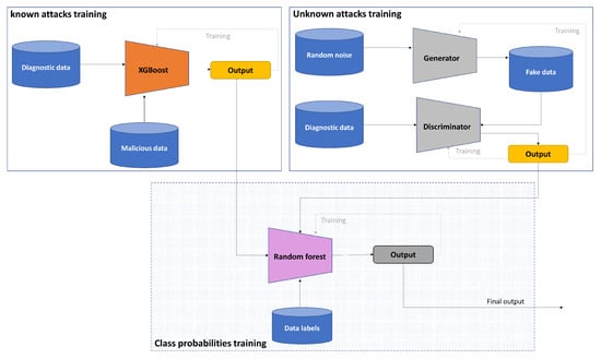 The training procedure of our framework is shown in Figure 4, where the GAN model trains on normal data exclusively for identifying unknown attacks, while the XGBoost trains on labeled datasets comprising malicious and benign data. The predicted class probabilities of each class from the two models after the training process are the input to the third phase in our framework, which makes the decision.
