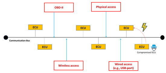 Vehicles have historically been developed without considering full security requirements, depending on the presumption that automobiles function autonomously with a lack of communication capabilities. However, incorporating a wireless gateway as a point of entry into the vehicle’s internal network facilitates remote interaction with the vehicle’s firmware, even during active vehicle operation. This enables remote diagnostics, eliminating the necessity for vehicle owners to physically visit a service station for diagnostics. Additionally, firmware updates can be effortlessly applied to numerous vehicles concurrently, circumventing the requirement to individually connect each vehicle via the On-Board Diagnostic (OBD) module and eliminating the need for cable attachment and detachment [4]. Thus, after the technological advancements in the automotive field, vehicles’ ECUs can be exploited physically through an OBD-II port or remotely through short or long wireless connection (e.g., Bluetooth or Telematics Control Unit (TCU)). Zhang et al. illustrated several ways to intrude on a vehicle including usage of the OBD-II port to monitor the traffic between the ECUs [5]. Most of the ECU-controlling threats leverage diagnostic updates, which enable downloading or updating software. Wolf et al. investigated the risks of ransomware attacks on automotive systems [6]. The ransomware may encrypt one of the vehicle’s critical ECUs, rendering it inoperable except if the user pays to unlock it. In 2015, security analysts showcased the capability to remotely exploit the infotainment system of Jeep Cherokee, gaining control of critical functions such as steering and brakes [7]. This incident prompted a massive vehicle recall and highlighted the security risks associated with vehicle connectivity.
