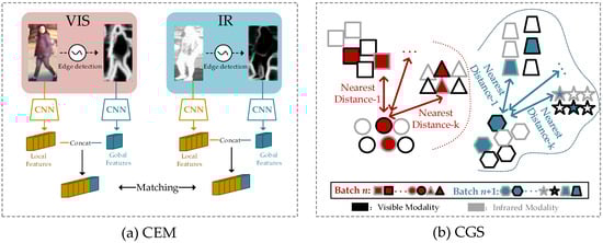 (a) Visible images and infrared images utilize the extended contour information obtained through contour detection to alleviate the modality discrepancy. Consequently, it becomes easier to match the same person between the visible and infrared modalities. (b) Different shapes represent different classes in the dataset. The CGS sampler first selects one class as an anchor. Next, it identifies the top-k nearest neighboring classes based on their distances to the anchor class. These selected neighboring classes are then included in the same batch for training.