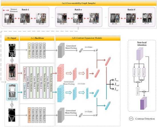 Our VI Re-ID framework is based on a two-stream convolutional neural network [4] but incorporates contour information to enhance the model’s cross-modal adaptability. The method we propose is outlined as shown in Figure 2, and the specific steps are as follows: First, the Cross-modality Graph Sampler (Section 3.1) samples the dataset with the aim of including categories that are close in distance into the same batch. The obtained samples consist of two modalities: visible and infrared modalities, both of which are obtained through contour extraction to produce their respective contour images. Next, these four categories (two types of original images and their corresponding contour images) of images are separately input into their corresponding backbone networks. Finally, the resulting sample features and contour features are fused in the Contour Expansion Module (Section 3.2) to mitigate the differences between the visible and infrared modalities.