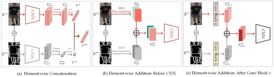 Element-wise addition. As shown in Figure 3b,c, we, respectively perform feature addition before the CNN and after Conv Block n . The specific formula is as follows: