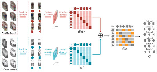 where represents the pairwise Euclidean distances calculated for the feature vectors and after aligning them along the zth dimension. Similarly, the process is applied to the infrared modality sample set: