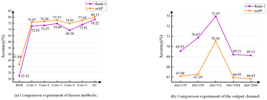 Besides, considering Section 3.1, for the method of fusing contour information, comparative experiments need to be conducted on different feature fusion methods, such as Element-wise addition and Element-wise concatenation (EC). Therefore, some comparative experiments are shown in Figure 5a, which can help determine which fusion method performs best in the task. Specifically, when our model adopts the Element-wise Concatenation fusion method, the mAP and Rank-1 accuracy of 72.97% and 70.54% is achieved, which outperformed other fusion methods and showed the best overall fusion performance. Taking into account the above analysis, the Element-wise Concatenation fusion method is employed for integrating contour information in this paper.
