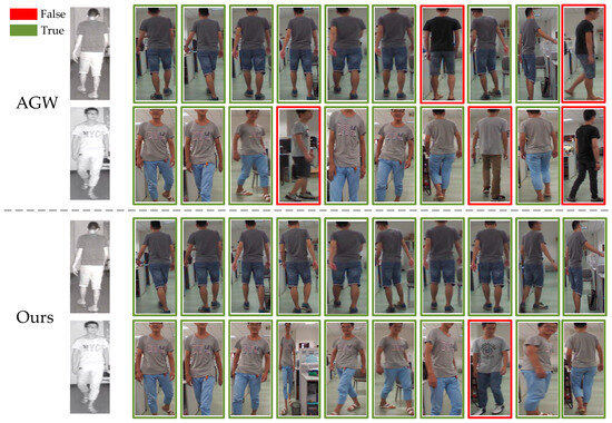 In this section, we compare our proposed method with the AGW [4] approach using the SYSU-MM01 dataset. For the comparison, two sample images are selected, one depicting the frontal view and the other showing the rear view of individuals, as query samples. The Rank-10 visualization results are presented in Figure 6.