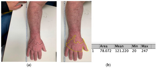 (a) The Quantitative Dynamic Allodynograph (QDA) stages iii + iv. The marked border indicates the allodynic area according to patient report. (b) The Quantitative Dynamic Allodynograph—stage v: Electronically marking and calculating the DMA area utilizing ImageJ, which output is in cm2. The Mean, Min and Max are calculated from the values of the pixels along the line. Specifically, Mean—smooths the current image by replacing each pixel with the proximity mean. Minimum (Min)—this filter performs grayscale erosion by replacing each pixel in the image with the smallest pixel value in that pixel’s proximity. Maximum (Max)—this filter performs grayscale dilation by replacing each pixel in the image with the largest pixel value in that pixel’s proximity.