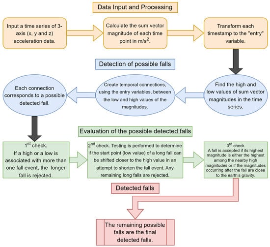 Accuracy constitutes the correct detections for non- and fall cases, highlighting their significance. While it is one of the most common metrics used, it should be treated cautiously, as it depends on the applied dataset. For instance, if a pipeline detects only falls when 95 falls and 5 non-falls exist, the accuracy would be 95%. The metric of sensitivity, or also recall, reveals how the system performs concerning positive detections. On the other hand, specificity reflects the algorithm’s ability to handle negative recognitions by determining the rate of correct non-falls detections. The above-mentioned metrics should be considered simultaneously, as each alone can lead to wrong conclusions. Finally, precision is defined as the system’s ability to avoid FPs. This metric is complementary to sensitivity. A high score for both sensitivity and specificity is desirable, as their balance is essential. However, a higher score on the former is preferred over the latter, as it is advantageous to detect more false falls than losing an actual one.