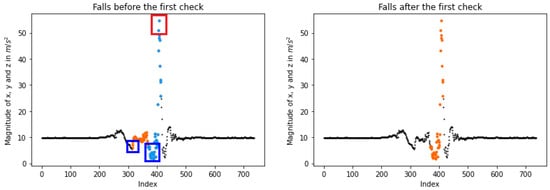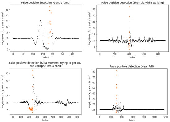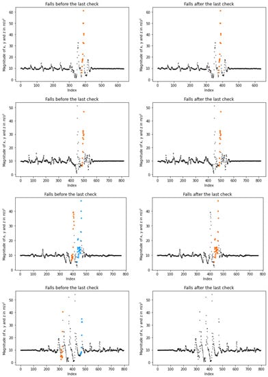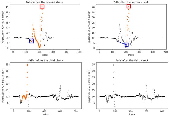 Table 6, we present every wrong detection that occurred before our last check. When it is not applied, the performance is reduced, particularly in the non-fall sub-classes, where the data patterns are similar to those of falls. It is worth noting that in KFall, when the last check is missing, the action “Gently jump trying to reach an object” presents false detections ranging from 99 to 109. Similarly, for “Jog normally with turn (4 m)”, these increase from 3 to 60; for “Jog quickly with turn (4 m)”, from 5 to 76; and for “Stumble while walking”, they rise from 59 to 84. Similarly, in MMsys, when the last check is missing, the “Near fall” sub-class, shows a score ranging from 85 to 92. Additionally, for “Ascending and Descending a staircase”, the wrongs increase from 4 to 19.
