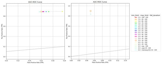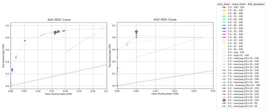 Table 2 are given through AUC–ROC curves. In these representations, each combination of thresholds is depicted on a plot, where the y-axis represents the true positive rate (TPR) or sensitivity, while the x-axis corresponds to the false positive rate (FPR), which is calculated as