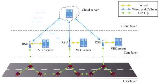 Task offloading in VEC is a process of transmitting the computation tasks and related parameters from the service requestor to the service provider through V2V or V2I communication. Figure 1 shows different layers of a VEC framework [].