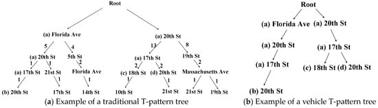 To compare the advantages of the vehicle T-pattern prediction tree in Definition 4 and the vehicle T-pattern tree in Definition 5, taking the Capital Bikeshare datasets as an example, we construct the traditional T-pattern tree in [,] and the vehicle T-pattern tree which is a portion of the vehicle T-pattern prediction tree.