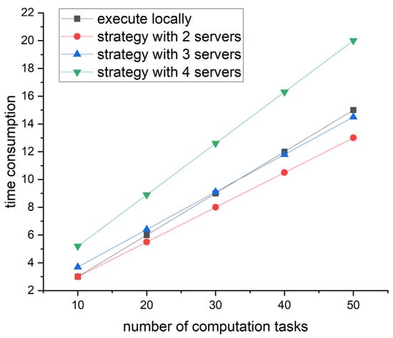 In terms of time consumption, the number of edge servers was set to two, three, four and five in our proposed method. The time consumption was calculated when the number of computational tasks was 10, 20, 30, 40 and 50. The calculation results are shown in Figure 5.