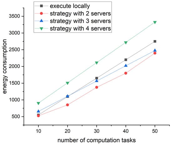 Figure 6 shows the energy consumption varies with the number of computation tasks under the four strategies. Overall, the strategy with two servers always has the lowest energy consumption, which proves that the strategy proposed in this paper is better than the traditional task offloading in terms of energy consumption. With regard to details, when the number of tasks is greater than 30, both the strategies with two and two servers outperform the traditional strategy. Meanwhile, the difference in energy consumption between the two strategies with two and three servers is small. Therefore, when optimizing the strategy, the strategy with the minimum number of servers should be selected. Similarly, in a dynamic network, if the number of servers is close, we need to select the best one based on real-time traffic.