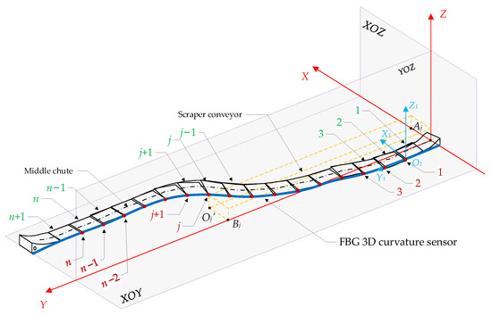 As shown in Figure 5, first sort the middle chutes (1, 2, 3... n + 1) of the scraper conveyor and the FBG (1, 2, 3... n) in the FBG 3D curve sensor. Suppose that the scraper conveyor starts to bend from the middle chute of section j and section k in the horizontal and vertical directions, respectively, and the middle chute of section (x + 1) is bent in both directions, then the curvature of the bending section in the horizontal and vertical directions are expressed as and , and the coordinate points set C1 and C2 of (x + 2) the FBG positions corresponding to the bending section and the coordinates of the beginning and end points of the bending section are, respectively, as follows: