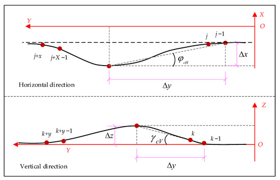 The angle at which the scraper conveyor deviates from the position of the fuselage under ideal conditions in both the horizontal and vertical directions is used to represent the bending degree of the fuselage (Figure 6). The angle of deviation is represented by the angle between the Y axis and the line, and the line is the maximum deviation point and departure point in the bending section. The deviation angle φcH of horizontal bending and the deviation angle γcV of vertical bending are calculated as follows: