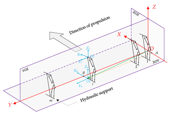 In Figure 7, local coordinate systems OiaXiaYiaZia (Oia-system), OibXibYibZib (Oib-system) and OicXicYicZic (Oic-system) are used to describe the attitude of the base, cover beam, and top beam of the hydraulic support, respectively, where i denotes the support number, a, b, and c denote the base, cover beam, and top beam, re spectively. And the initial state of the local coordinate system is consistent with the reference coordinate system. The coordinate system conversion is used to describe the attitude of each part of the hydraulic support in the d-system. The conversion of d-system to the local coordinate system is achieved by rotating φ, θ, γ around Z, X, and Y, respectively, three times as follows:
