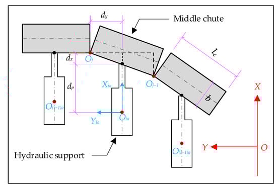 The origin Oia of the local coordinate system of the hydraulic support base is selected as a reference point to describe the position of the hydraulic support (Figure 7). The vector denotes the position of a hydraulic support in the d-system at some time. Therefore, the vector denotes the position of the hydraulic support in the d-system at this time as follows: