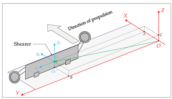 The fiber optic inertial measurement unit used to obtain the attitude information of the shearer also needs to transform coordinate system (Figure 9). Similar to the description of the attitude of the hydraulic support, it describes the attitude information of the shearer in d-system. As with Equation (4), the conversion of the same d-system to the ObXbYbZb (Ob-system) of the shearer is realized by rotating φ, θ, and γ around Z, X, and Y, respectively, by three times of a single coordinate axis. The conversion of coordinate system can be realized by combining Equations (11) and (6).