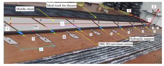 An indoor test system was set up to verify the mathematical model of the spatial relationship between the three machines. The indoor test platform was built with the straightness sensing system of the scraper conveyor as the center. As shown in Figure 11, the FBG 3D curvature sensors containing 7 FBG positions were laid, and the FBG positions were ranked from 1 to 7 from right to left. Then, the 8 middle chutes and 10 hydraulic supports are simulated on both sides of the FBG 3D curvature sensor. The length of the middle chutes is lc = 1.75 m and the width b = 0.8 m, and the sequence is from 1 to 8. The distance between the hydraulic support dh = 1.75 m, the distance between the hydraulic support and the middle chute dp = 1.2 m, in order of from 1 to 10, where the negative direction of the Y axis hydraulic support one (k = 1); that is, the position of the first FBG is between the second and the third hydraulic support (N = 1). Then, Equation (9) is transformed into the following: i = j + 1.