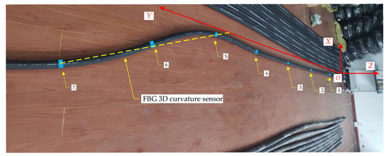 As shown in Figure 11, the following is a set of coordinate points for 7 FBG positions: Cs1 = {q1, q2, q3…q8} = {(−0.45, 1.77, 0), (−0.44, 3.53, 0), (−0.44, 5.29, 0), (−0.45, 7.05, 0), (−0.45, 8.80, 0), (−0.45, 10.44, 0), (−0.46, 12.20, 0)}.