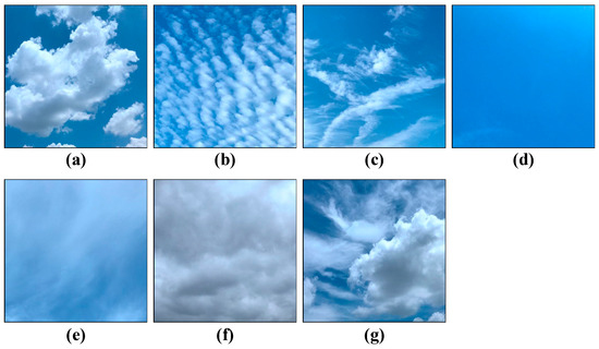 Examples of cloud images from the GCD dataset: (a) cumulus (Cu); (b) altocumulus (Ac); (c) cirrus (Ci); (d) clear sky (Cl); (e) stratocumulus (Sc); (f) cumulonimbus (Cb); (g) mixed (Mi).