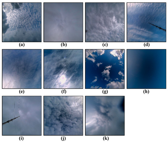 Example of cloud images from the HBMCD dataset: (a) altocumulus (Ac), (b) altostratus (As), (c) cumulonimbus (Cb), (d) cirrocumulus (Cc), (e) cirrus (Ci), (f) cirrostratus (Cs), (g) cumulus (Cu), (h) no cloud (No), (i) nimbostratus (Ns), (j) stratocumulus (Sc), and (k) stratus (St).