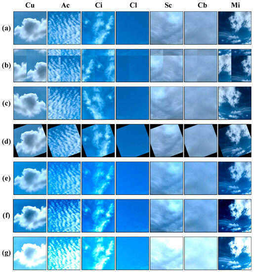 Example of cloud images added by data augmentation: (a) original image, (b) translation, (c) flipping, (d) rotation, (e) color enhancement, (f) contrast enhancement, (g) brightness enhancement.