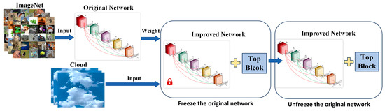 Transfer learning approaches can be categorized according to four types of technologies used: instance-, map-, network-, and adversity-based. Instance-based transfer learning refers to the selection of some instances from the source domain as a supplement to the training set of the target domain and is applicable to cases in which the weights of some instances in the source domain can be assigned to the target domain for use despite the differences between the two domains. Map-based transfer learning refers to mapping the instances of the source and target domains to a new data space, which is applicable to the case in which the instances of both domains are similar. Network-based transfer learning refers to neural network-based training in which part of the network in the source domain is trained in advance and migrates it to the target domain. It is suitable for large-scale datasets in the source domain, and the features extracted from the network are universal. Adversity-based transfer learning introduces adversative layers to find common transferable representations of source and target domains and does not emphasize the training of network features and accuracy improvement [27]. However, in the field of ground-based cloud classification, we used network-based transfer learning to pre-train the network on the large-scale dataset ImageNet and migrate it to the target dataset. Figure 5 shows a network-based transfer learning architecture, taking the DenseNet [28] model as an example. The upper part of Figure 4 represents the pre-training part of the network in the ImageNet dataset. The parameters for pre-training are transferred to the ground-based cloud classification model below for training. The lock icons shown in the lower network indicate that the parameters of the network layer in front are frozen at the beginning of training.