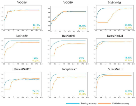 Experimental comparison of the nine networks. The horizontal axis represents epochs and the vertical axis indicates recognition accuracy. The blue value represents the accuracy of the training set and the orange value represents the accuracy of the test set.