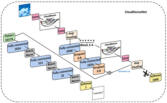 Dense connection allows the reusing of features. Its short-circuit connection mechanism is reflected in the Dense Block module in Figure 6. These two structures have regularization benefits and reduce issues from overfitting. Thus, the analysis of various networks shows that although there are many variants of DenseNet, considering that there are large-scale datasets used in the experiment, the DenseNet121 model with its fewer layers is an optimal basic model for the ground-based cloud classification task in this experiment to avoid overfitting problems.