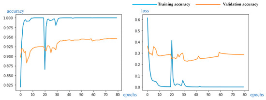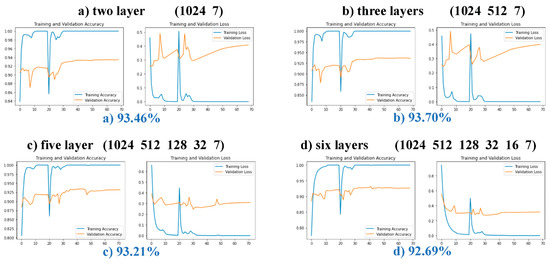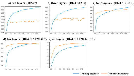 In the first experiment, 20 epochs were trained with a learning rate of 0.0001, and the experimental results are shown in Figure 14. The 2-layer and 3-layer test sets constantly exhibited low accuracy due to poorer layer fitting, while the three other kinds of structure curves of the training and testing sets rose steadily. The reason may be that the two schemes have fewer layers and are prone to overfitting during training, resulting in the accuracy rate fluctuating all the time. The results of the second experiment are shown in Figure 15. After 40 epochs, the experimental curves of the 2-layer and 3-layer structures showed increases in loss without changes in accuracy, which is a common indication of overfitting. The final test set accuracies of the 4-layer, 5-layer, and 6-layer structures were compared. The experimental curve of the 4-layer structure is shown in Figure 10. The 4-layer top structure network had the highest accuracy. Compared with the 5-layer and 6-layer solutions, the 4-layer solution has fewer network layers and fewer parameters for training, which is conducive to lightweighting the model. This proves the feasibility and superiority of the 4-layer top-level network scheme.