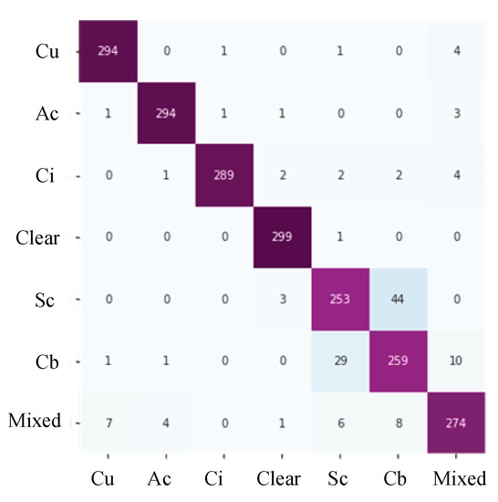Table 4 shows the GCD dataset’s precision, recall, F1-score, and accuracy of each category. The accuracy reached 93.43%, and the metric data of cumulus, altocumulus, cirrus, clear sky, and mixed all exceeded 90%. Regarding the confusion matrix, the precision, recall, and F1-score of the test showed that the error of each category was low, with only a few categorization errors. Altocumulus cloud, cirrus cloud, and clear sky have good representation, one category contains 300 test samples, and only a few samples are misjudged. In addition, the precision, recall, and F1-scores of these categories are good, and approach 98%. It can be observed from Figure 1 that the features of these categories are significantly different from those of other categories. However, compared to other categories, the precision, recall, and F1-score of stratocumulus and cumulonimbus is less than 90%, only 88% and 84%, respectively.The identification error was comparatively high between stratocumulus and cumulonimbus, owing to the high similarity between these two categories. These two clouds both cover the sky with closely resembling colors and textures. This underscores the significant influence of both color and texture information on the recognition performance of the CloudDenseNet model. With the passage of time, these two cloud categories might potentially undergo transformation under certain conditions. Color and texture information should be studied in future experiments to achieve higher accuracy and distinguish between the two categories.