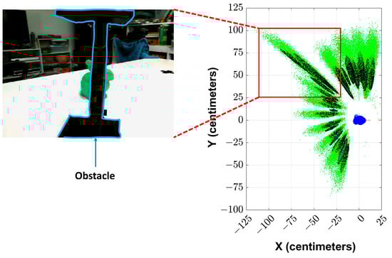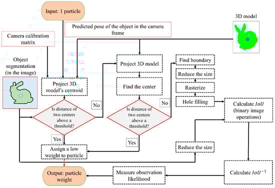 - Particle weighting corresponds to the update step in DBN. The particles are weighted using observation likelihood. In this research, the actual and the predicted observations are obtained using semantic segmentation of the object and the predicted projection (onto the camera) of the object, respectively. This is explained in more detail in Section 3.2 and Section 3.3.