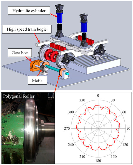 Dynamic characteristics of the front cover were experimentally studied on a test bench, as shown in Figure 2. The roller was out-of-round and a 13th-order polygonal wear was formed along the circumference of the tread, the polygonal roller not only simulated the rail but also transformed the roller polygonization into the wheel polygonization by high-speed rotating under the drive of the motor. The weight of the car body was applied by the hydraulic cylinder; thus, the high-speed advance of the polygonal wheel on the rail was simulated successfully at the test bench [41].