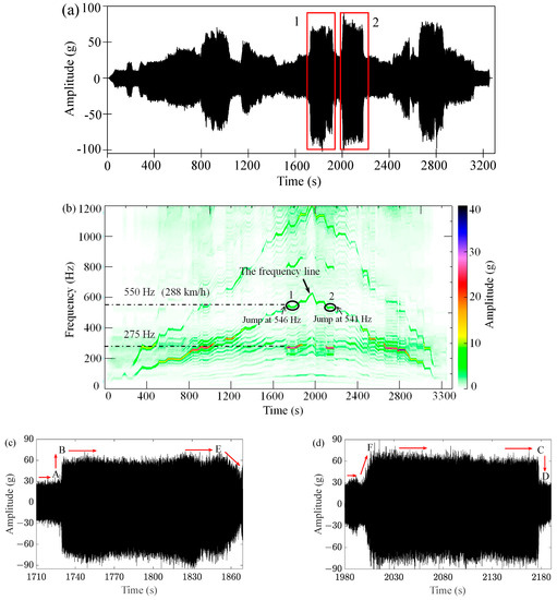 Figure 3c,d represent the time-domain signals at region 1 and 2 in Figure 3a. Figure 3c shows the jump phenomenon in the acceleration process;. the direction of the arrows represent an increase in speed, the response amplitude jumped from A to B when the wheel speed increased to v1, which was slightly less than 288 km/h. Speed was constant between B and E, then the wheel speed continued to increase, but the vertical amplitude of the front cover gradually decreased until the maximum test speed of 320 km/h was reached. In contrast, the jump phenomenon in the deceleration process is shown in Figure 3d; while the direction of the arrows represent an decrease in speed, vertical vibration of the front cover gradually increased to maxima at F when the speed was reduced to v2 (v2 was slightly smaller than v1). Speed was constant between F and C, followed by the jump phenomenon from C to D when the speed continued to decrease from v2. In short, the jump phenomenon of vibration amplitude occurred below the natural frequency, which corresponds to the soft spring curve in Figure 5.