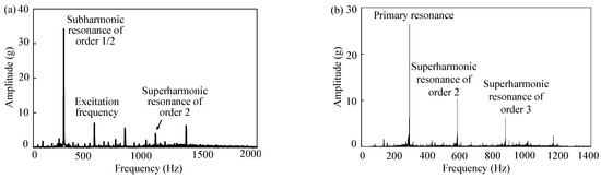 Spectral analysis results of the signal of Figure 3c are represented in Figure 4a; obviously, superharmonic resonance of order 2 for the front cover also occurred. Figure 4b represents the spectral analysis results of vertical vibration of the front cover under wheel radial deviation of 0.1 mm and excitation frequency of 280 Hz. According to the main frequencies in Figure 4b, the front cover was not only in primary resonance but also in superharmonic resonance of order 2 and 3.