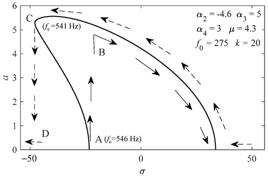 In this study, ε = 0.2, f0 = 275 Hz, and . As shown in Figure 3b, the jump phenomena occurred at fe ≈ 545 Hz in the acceleration process and fe ≈ 540 Hz in the deceleration process; therefore, the difference of σ was about 25 between the two jump points. It is difficult to determine the coefficient of nonlinear term in both theoretical calculation and experimental analysis; a set of values of , and is given to make the frequency response (Figure 6) and acceleration response (Figure 7) as close to reality as possible. As shown in Figure 6, the subharmonic resonance amplitude a jumped as the change of fe. The solid arrows represent the increase process of fe; a jumped upward from A to B when fe increased to about 545 Hz, then a gradually decreased as fe continued to increase. In the decrease process of fe, which is marked with the dotted arrows, a gradually increased as fe decreased, and jumped downward from C to D until fe decreased to about 540 Hz. It can be seen that the two jump phenomena correspond to the jump phenomena of the acceleration and deceleration process in the bench test (Figure 3c,d), respectively.