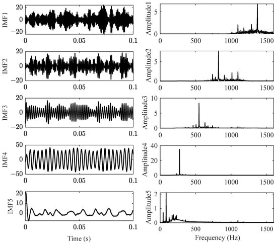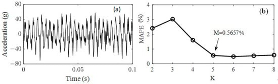 Figure 7a is the locally amplified signal of Figure 3c; there are several frequency components for vertical vibration of the front cover. The test acceleration signal was decomposed by VMD to obtain the main frequencies and reduce noise; the VMD function decomposes a signal into a small number K (K ≥ 2) of narrowband intrinsic mode functions (IMFs) and can effectively avoid modal aliasing and edge effects. To avoid over-decomposition and under-decomposition, the appropriate number K can be predicted by the evaluation index of the mean absolute percentage error (MAPE) [46], which represents the ratio of the residual after VMD decomposition to the original signal. In this paper, the minimum K value with MAPE value less than 1% was selected as the optimal number of mode decomposition. Through verification, as shown in Figure 7b, it was found that K = 5 (MAPE = 0.5657%) was appropriate. As shown in Figure 8, the test signal (Figure 7a) was decomposed to five IMFs; each IMF has a central frequency, and IMF 3 and IMF 4 represent the 550 Hz vibration and 275 Hz vibration, respectively; the former is the excitation frequency of wheel polygonization, while the latter is the subharmonic resonance frequency.
