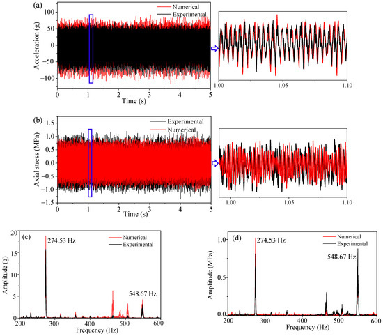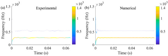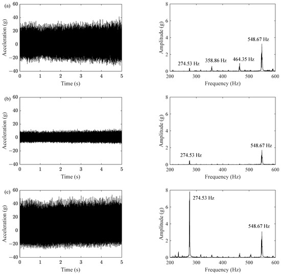 As shown in Figure 10, the time-frequency spectrums of the two signals were obtained by HHT. The energy distribution showed that both the signals contained frequencies of 275 Hz and 550 Hz, and 275 Hz was the main frequency; in other words, subharmonic resonance of order 1/2 was the most outstanding vibration characteristic, which is also a key point throughout this study. Consequently, it was further proved that the SDOF modeling method is reasonable and feasible to simulate the vertical vibration of the front cover.