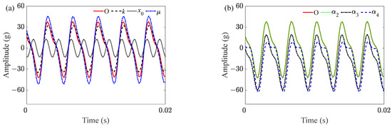 In this subsection, the effect of multiple parameters on subharmonic resonance response of the front cover was analyzed. As shown in Figure 11a, it was effective to reduce the vibration amplitude by changing the excitation amplitude and the initial condition. The effect of the linear damping coefficient μ on vibration response was closely related to initial conditions; under the nonzero initial condition, the decrease of μ increased the subharmonic resonance response. However, subharmonic resonance was not excited in the zero initial condition; even if μ was further reduced, the vibration amplitude was much smaller than the response in subharmonic resonance. As shown in Figure 11b, subharmonic resonance was more sensitive to and than to . In addition, there is no doubt that f0 and fe have great influence on the subharmonic resonance, but as long as , changing the natural frequency of the derived system will only change the cycle period without affecting the occurrence of subharmonic resonance.