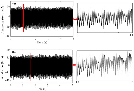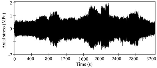 In recent years, scholars have proposed some novel theoretical models for fatigue life prediction [30,31]. Although theoretical models can yield accurate solutions provided that accurate models can be built, it is difficult for structures under complex loads. There are several dynamic stress simulation methods combining experimental and numerical analysis suitable for bolt dynamic stress simulation. The quasi-static superposition method and the modal superposition method are two common methods in structural dynamic stress simulation. The quasi-static superposition method [32,33] is widely used during the design stage, but this method is not suitable for resonance stress simulation. As for the modal superposition method, the main idea is to obtain the load-stress TF (Transfer Function) of structure, and the external loads are often processed as PSD (Power Spectral Density) in prior research cases [32,34,35,36]; then, the stress PSD can be calculated by multiplying the load PSD by the load-stress TF. Although the modal superposition method is suitable for dynamic stress simulation under resonance conditions, the phase information of the load PSD and TF is ignored. In fact, the effect of the phase between multiaxial excitations on the stress response is so significant that it cannot be ignored; fortunately, the modal superposition method based on FFT of multiaxial excitations and load-stress FRFs takes into account the phase information of multiaxial excitations and was chosen as the bolt dynamic stress simulation method [22].