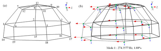where , , are the rth modal mass, modal damping, and modal stiffness, respectively; is the excitation frequency; is the real value mode vector; is the rth strain mode corresponding to ; ; E is elastic module.